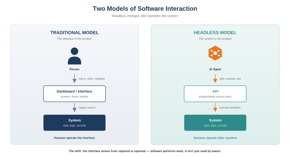 Headless changes that model. Systems are exposed through APIs so other systems, including AI, can access them directly. The interface becomes optional. The system itself becomes the product.