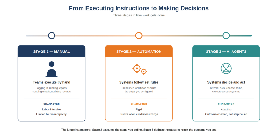 Automation has been available for years but it requires predefined rules. Every step has to be configured in advance. The system can only follow the paths it’s given. When conditions change, workflows break or require manual intervention.
